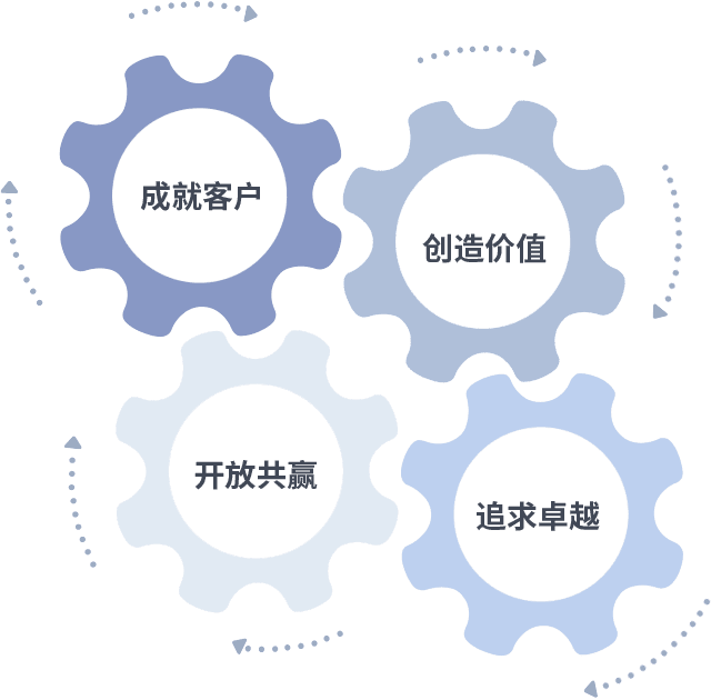 成就客户是一切决策的出发点,,,创造价值是衡量所有工作的标准,,追求卓越是我们做事做人的态度,,,开放共赢是我们的格局也是最终的结果。。。价值观的齿轮环环相扣,,,推动着组织里的每个人不断向前。。